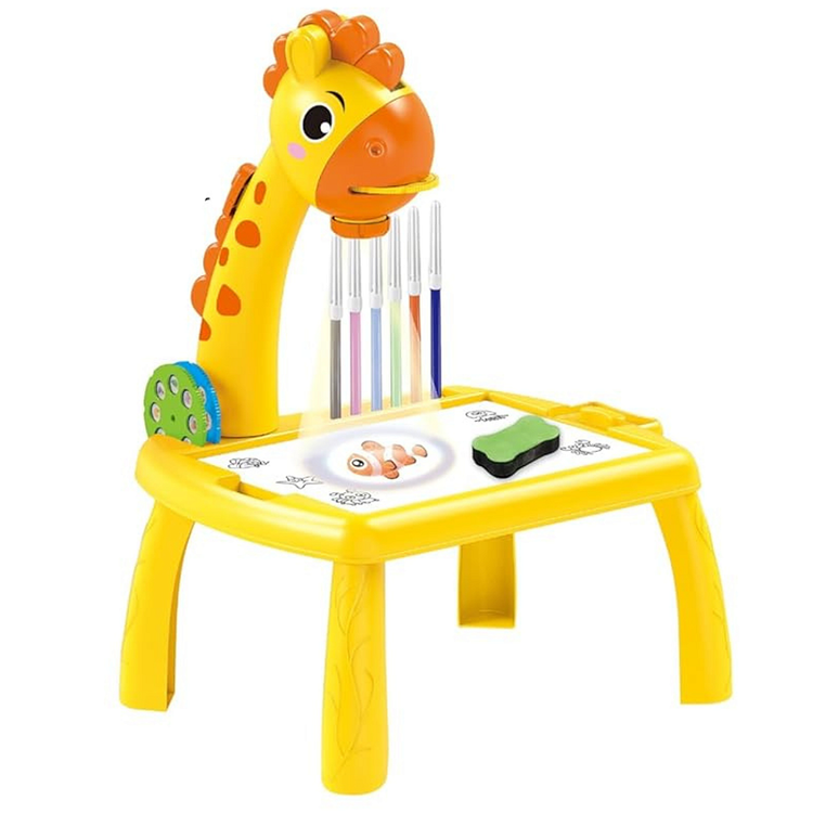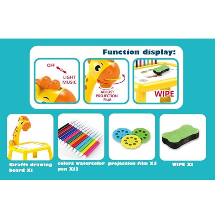 محصول Giraffe Painting Table با رعایت استانداردهای ایمنی کودکان طراحی شده است. بدنه میز از پلاستیک ABS با لبههای کاملاً گرد ساخته شده تا هیچ خطری برای دستان ظریف کودک نداشته باشد. پروژکتور تعبیه شده در سر زرافه دارای قابلیت تنظیم فوکوس (وضوح تصویر) است که به کودک کمک میکند طرحها را با دقت بالا تماشا و ترسیم کند. یکی از مزیتهای بزرگ این میز، قابلیت پخش موزیک حین نقاشی است که فضای بازی را آرامشبخش و لذتبخشتر میکند. تختهی اصلی این میز قابلیت پاک شدن سریع را دارد؛ بنابراین کودک میتواند بارها و بارها یک طرح را تمرین کند. در پکیج ارسالی فروشگاه ال آی تویز، علاوه بر ماژیکها، اسلایدهای دایرهای با طرحهای متنوع شامل حیوانات، میوهها و وسایل نقلیه وجود دارد که دایره اطلاعات عمومی کودک را نیز گسترش میدهد.